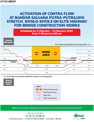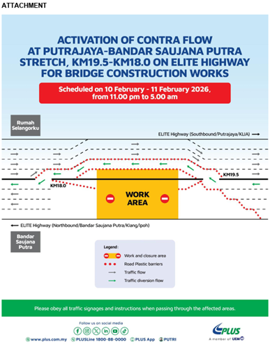 To facilitate the construction project, PLUS Malaysia Berhad (PLUS) would like to inform that a series of traffic diversions will be implemented along the Kulai–Sedenak stretch from 9 February to 12 February 2026 to facilitate safe installation of bridge beams as follows:-