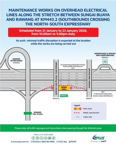 Petaling Jaya, 20 January 2026:- PLUS Malaysia Berhad (PLUS) wishes to inform the maintenance works on overhead electrical lines will be carried out along the stretch between Sungai Buaya and Rawang Interchange at KM443.2 (Southbound) crossing the North-South Expressway (NSE) on 21 January (Wednesday) to 23 January 2026 (Friday), from 10.00am to 4.00pm daily throughout the period by Tenaga Nasional Berhad (TNB).